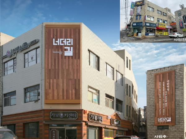 아산시는 해당 지역을 새롭게 정비하면서 ‘너더리길’이라는 골목길 브랜드를 만들고, 설화를 모티브 삼아 목재를 활용한 건축물 입면 개선, 옹벽 및 간판 디자인 등을 진행했다.