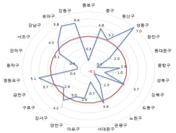 [한국연예축제일보, 안성경기자] 서울특별시 성동구가 2018년 기준으로 지역내총생산(GRDP)이 전년 대비 7.0%의 성장률을 기록, 서울시 25개 자치구 중 최대 성장을 이룬 것으로 나타났다.