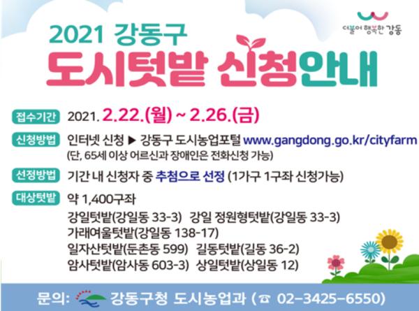 [한국연예축제일보, 유혜경기자] 서울특별시 강동구는 오는 2월 22일부터 26일까지 「2021년도 강동구 도시텃밭」 참여자를 모집한다. 분양하는 텃밭은 강일, 가래여울, 길동, 암사, 상일, 일자산 텃밭으로 총 6개소 1,400여구좌이다. 올해는 예년과 달리 신청자 중 추첨을 통해 참여자를 선정한다.