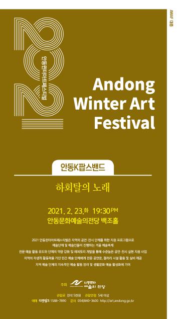 [한국연예축제일보, 이순례기자] 안동문화예술의전당은 '2021 안동윈터아트페스티벌AWAF(Andong Winter Art Festival)’의 네 번째 공연 ‘안동K팝스밴드의 하회탈의 노래’를 오는 23일 오후 7시 30분 백조홀에서 진행한다.