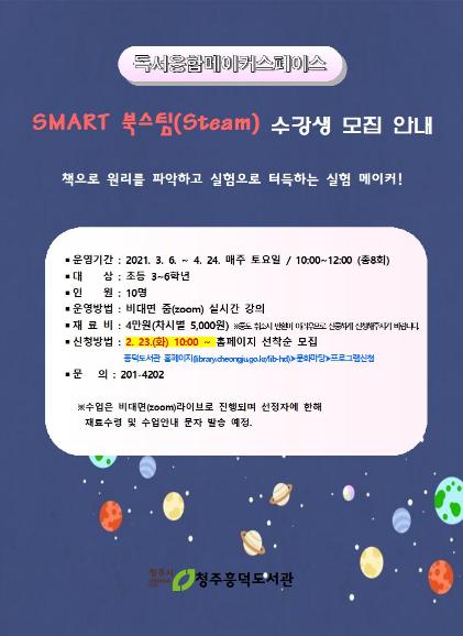 오는 3월부터 운영하는 ‘SMART 북스팀(Steam)’은 책으로 원리를 파악하고 실험으로 터득하는 실험과학 메이커로 ▲울림 레이저 만들기 ▲소리 현악기 만들기 ▲그림자 극장 ▲태양광풍차 만들기 ▲스마트 홈 만들기 등 매 수업마다 과학의 원리를 이해하고 다양한 메이킹 활동으로 진행된다.