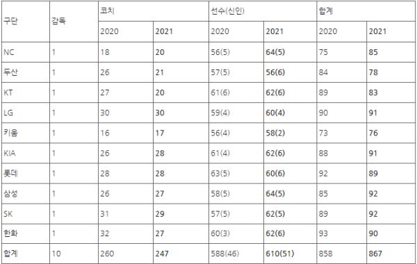 전체 소속선수 등록 숫자는 늘어났지만 코치는 13명이 줄었다. 올해 등록된 코치는 총 247명이며 지난해에는 260명이 등록됐었다. LG가 가장 많은 30명, 키움이 가장 적은 17명의 코치를 등록했다.