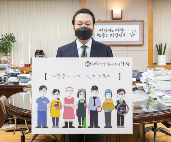 [한국연예축제일보, 유혜경기자] 노현송 서울 강서구청장이 19일 구청 집무실에서 ‘고맙습니다. 필수노동자’ 챌린지에 동참했다.