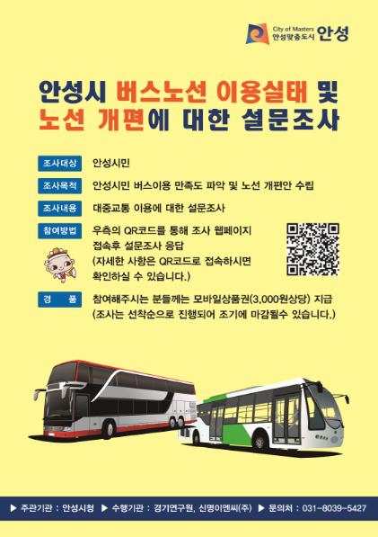 [한국연예축제일보, 유혜경기자] 안성시는 시내버스 이용만족도 및 노선체계 개편방안 수립용역과 관련하여 이용 시민들의 설문조사를 2월 22일부터 3월 12일까지 3주간 실시한다고 밝혔다.