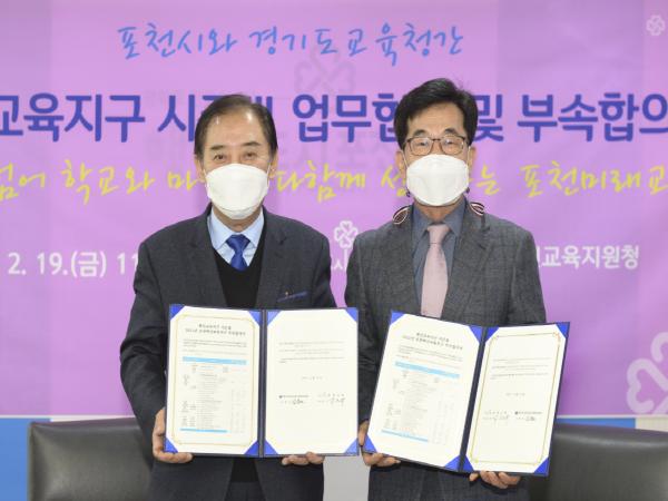 이를 위해 19일 포천시 브리핑룸에서 박윤국 포천시장과 심춘보 포천교육장, 손세화 포천시의회 의장이 참석한 가운데 포천형 혁신교육지구 시즌Ⅲ 업무협약 및 2021년 사업에 대한 부속합의서 체결식을 개최했다.