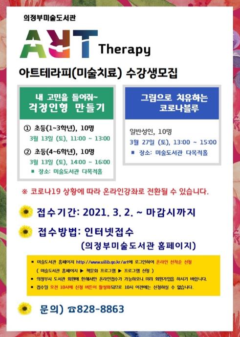 [한국연예축제일보, 안성경기자] 의정부미술도서관은 코로나19로 지친 시민들의 일상에 활력을 주고 마음을 치유할 수 있는 아트테라피(미술치료) 프로그램을 2021년 3월 13일부터 운영한다.