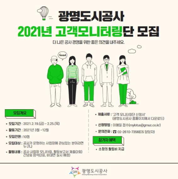 [한국연예축제일보, 유혜경기자] 광명도시공사는 시민참여 경영 실현과 고객 눈높이에 맞는 서비스 제공을 위한 '2021년 고객 모니터링단’을 모집한다.