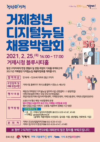 [한국연예축제일보, 유혜경기자] 거제시는 오는 25일 거제시청 블루시티홀에서 ‘거제청년 디지털뉴딜 채용박람회’를 개최한다. 코로나19 확산 예방을 위해 분산 운영하며 만 18세에서 39세 이하의 청년 구직자를 대상으로 진행한다.