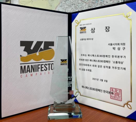 [한국연예축제일보, 허난세기자] 서울시의회 도시안전건설위원회에서 의정활동을 하고 있는 박상구 의원(더불어민주당, 강서1)이 2월 8일 매니페스토 소통대상 분야 '최우수상'을 수상했다. 박 의원은 시민과의 소통을 기반으로 의정활동을 펼쳐왔고, 집행부에 대한 견제와 협치에 앞장서는 등 지역사회 발전과 지방 의정 발전에 기여한 공로를 인정받아 수상하게 됐다.