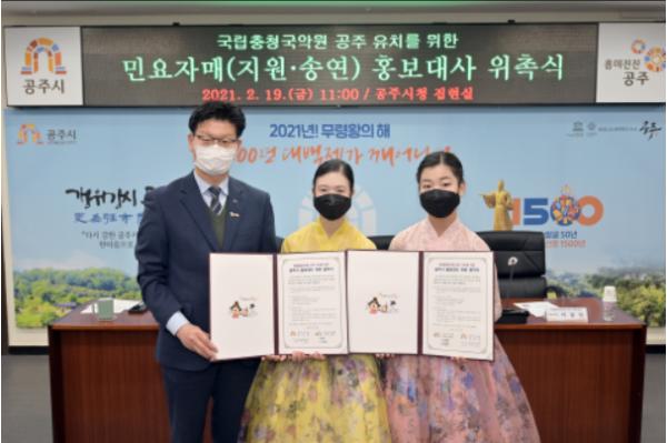 [한국연예축제일보, 유혜경기자] 공주시는 19일 시청 집현실에서 2019년 남상일, 2020년 김영임에 이어 올해 이지원, 이송연 민요자매를 국립충청국악원 공주 유치 홍보대사로 위촉하고 홍보활동에 박차를 가하기로 했다고 밝혔다.