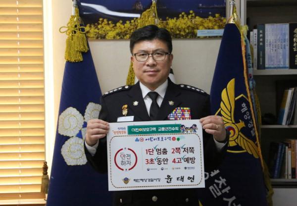 [한국연예축제일보, 김채영기자] 행정안전부가 주관하는 ‘어린이 교통안전 릴레이 챌린지’행사에 바다경찰 윤태연 태안해양경찰서장도 지난 19일 동참의 뜻을 밝히며 어린이 교통사고 줄이기 노력에 힘을 보탰다.