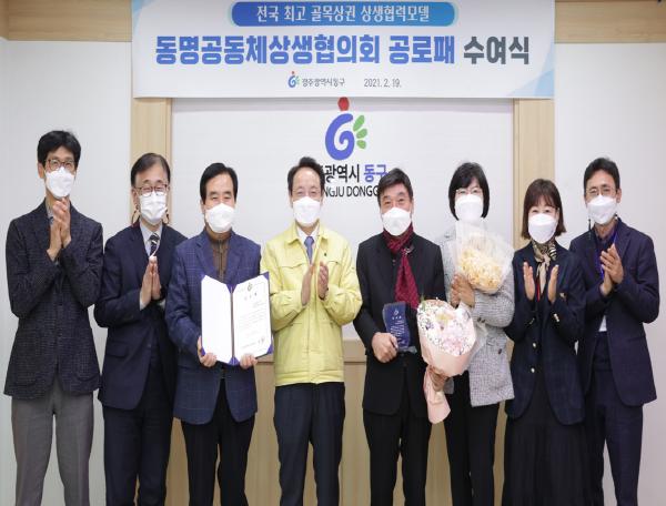 [한국연예축제일보, 유혜경기자] 광주 동구는 주민 스스로 마을 문제를 해결하기 위해 상생협의회를 꾸리고 동명동 상생발전과 골목경제 활성화에 앞장서 온 동명공동체상생협의회(회장 최복현)에 공로패를 수여했다고 밝혔다.