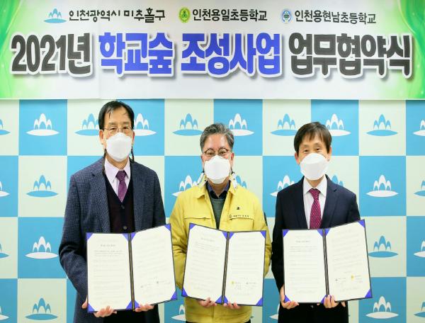 인천 미추홀구(구청장 김정식)는 19일 구청장실에서 김정식 미추홀구청장과 최왕림 인천용일초등학교 교장, 진동석 인천용현남초등학교 교장이 참석한 가운데 2021년 학교 숲 조성사업 업무추진을 위한 협약을 체결했다.