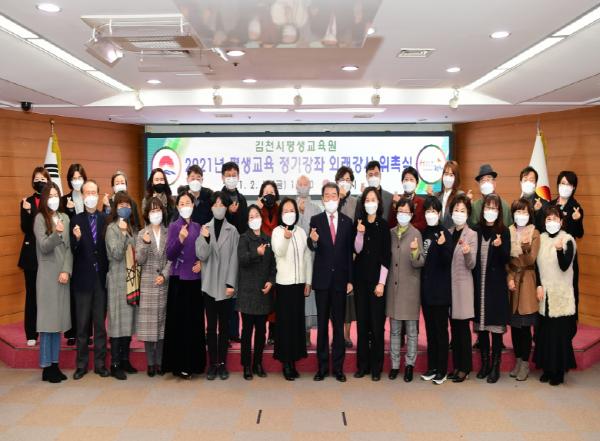 김충섭 김천시장은 “평생교육 정기강좌의 외래강사로 위촉됨을 축하하며, 지난해는 유래없는 코로나19로 인해 시민들이 평생학습을 실천하기가 매우 어려웠지만, 2021년엔 다양한 학습을 통해 희망을 찾는 평생학습시대를 만들고, 시정목표인 『시민 모두가 행복한 김천』을 실현하는데 함께 노력해 주시기 바란다”고 당부했다.