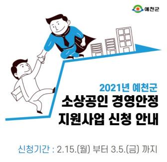 [한국연예축제일보, 안성경기자] 예천군이 3월 5일까지 코로나19 장기화 등으로 어려움을 겪고 있는 지역 내 소상공인을 돕기 위해 ‘예천군 소상공인 경영안정 지원사업’을 신청·접수를 받는다고 밝혔다.