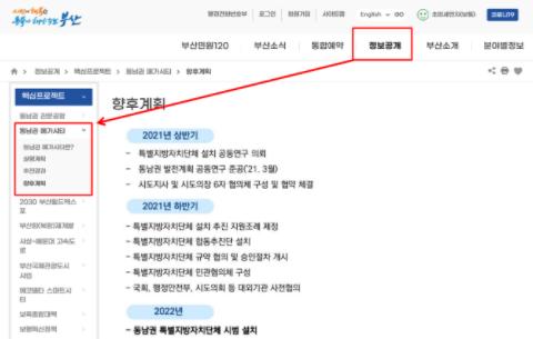 이에 부산시는 동남권 메가시티에 대한 시민들의 궁금증을 해소하고, 정책 소통을 강화하려는 목적으로 게시판을 신설하였다. 핵심프로젝트인 만큼 앞으로도 동남권 메가시티 진행 상황에 대한 자료를 수시로 업데이트하여 시민에게 신속하고 정확한 정보를 제공할 예정이다.