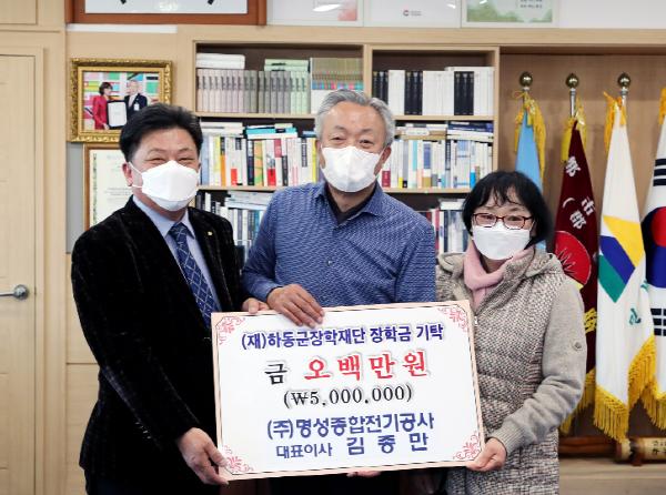 (재)하동군장학재단은 (주)명성종합전기공사 김종만 대표가 지난 19일 군수 집무실을 찾아 고향 후학들을 위해 써달라며 장학기금 500만원을 기탁했다고 23일 밝혔다.