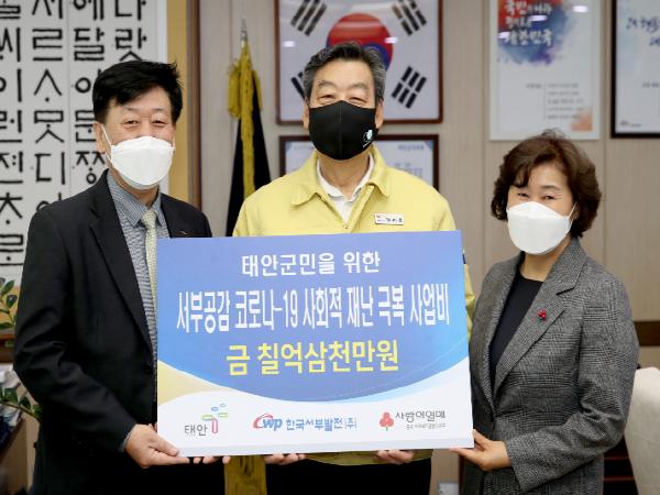한국서부발전(주)가 코로나19 사태의 장기화로 큰 어려움을 겪고 있는 태안군민들을 위해 후원금을 전달하며 지역 사랑의 마음을 전했다.