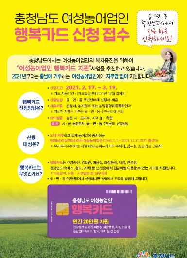 [한국연예축제일보, 유혜경기자] 공주시가 여성농어업인의 문화?복지 생활 영위와 삶의 질 향상을 위해 2021년도 여성농어업인 행복바우처 사업을 실시한다고 23일 밝혔다.