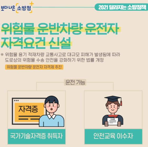 또한, 6월 10일부터 위험물 안전관리와 관련된 업무수행 능력 습득 및 향상을 위해 위험물 운반자에 대한 자격 및 교육의무에 관한 법률이 시행 되면서, 위험물 운반자는 국가기술자격법에 따른 위험물 분야의 자격을 취득하거나 한국소방안전원의 위험물운반자 강습교육을 받아야 한다.