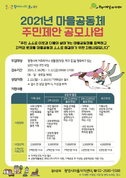 2021 광명시 마을공동체 주민제안 공모사업은 주민 스스로 이웃과 더불어 살아가는 마을공동체를 만들고 지역의 문제를 마을공동체 스스로 해결도록 지원하는 사업이다.
