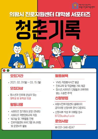 대학생 서포터즈‘청춘기록’은 청소년 대상 멘토활동 및 진로분야에 관심이 많은 의왕시 20~24세의 대학생 및 휴학생을 대상으로 15명을 모집하며 4월부터 본격적인 활동을 시작한다. 참가자격은 멘토가 되어 교류할 수 있는 대학생이면 누구나 지원이 가능하다.