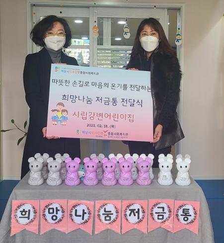 미사강변 17단지에 위치한 시립강변어린이집에서 어려운 이웃들을 위해 원아들이 십시일반 모은 저금통을“좋은 일에 써 주세요!”라고 말하면서 복지관장에게 직접 전달하여 아이들과 사랑의 마음을 함께 나눌 수 있는 뜻깊은 시간이었다. 또한, 시립강변어린이집은 2019년에도 1년 동안 모은 저금통을 미사1동 행정복지센터에 전달하는 등 우리지역 내 어려운 이웃들을 위해 나눔을 실천해 오고 있다.