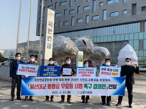 이날 고양시의회 이길용 의장과 상임위원회 위원장 등 6명은 전주시에 위치한 국민연금공단을 방문하여 한강교량 중 유일하게 통행료를 징수하고 있는 일산대교 통행료 무료화 촉구를 요구하는 서한을 전달하였다.