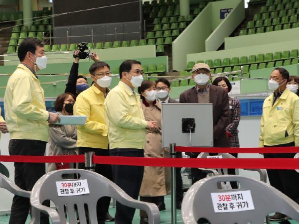 허 시장은 마산실내체육관 지역예방접종센터(이하 ‘마산접종센터’) 내 접종계획에 대해 보고받은 뒤 현장을 살펴보며 접종 동선에 따라 준비상황을 점검했다.