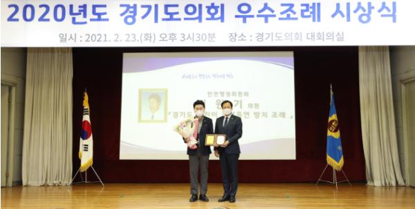 [한국연예축제일보, 허난세기자] 경기도의회 김원기 의원(더불어민주당, 의정부4)이 지난 2019년 10월에 발의한 「경기도 어린이 간접흡연 방지 조례」가 23일(화) 경기도의회 1층 대회의실에서 ‘2020 경기도의회 우수조례’에 선정되어 경기도의장상을 수여받았다.