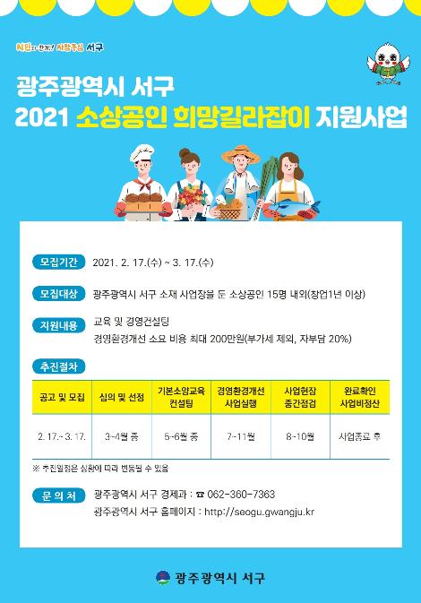 [한국연예축제일보, 유혜경기자] 광주 서구가 소상공인의 경쟁력 강화와 경영안정을 위한 “2021 소상공인 희망길라잡이 지원사업”을 추진한다고 밝혔다.