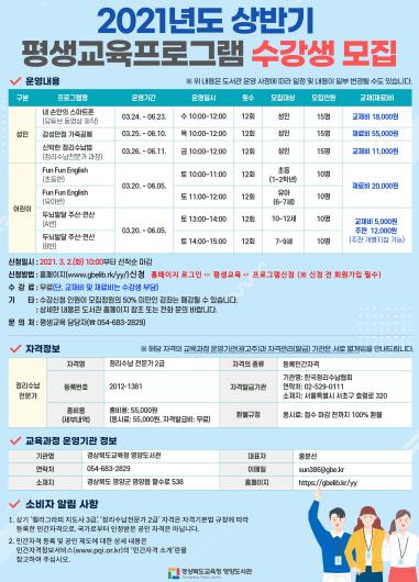[한국연예축제일보, 서병진기자] 경상북도교육청 영양도서관은 지역주민들에게 전 생애에 걸친 배움과 여가선용의 기회를 제공하고자 ‘2021년도 상반기 평생교육프로그램’을 개설해 수강생을 모집한다.