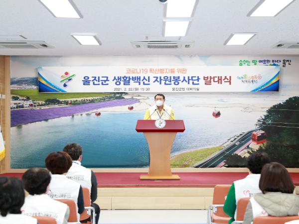전찬걸 울진군수는 격려사를 통해 코로나19 예방활동의 선봉장이라는 어려운 역할을 맡아주신 생활백신 자원봉사단원에 고마움을 표하며,“빠른 시일 내 집단면역이 형성되어, 군민들이 코로나19 이전의 일상을 회복할 수 있도록 생활백신 자원봉사단의 활약을 기대한다”고 말했다.