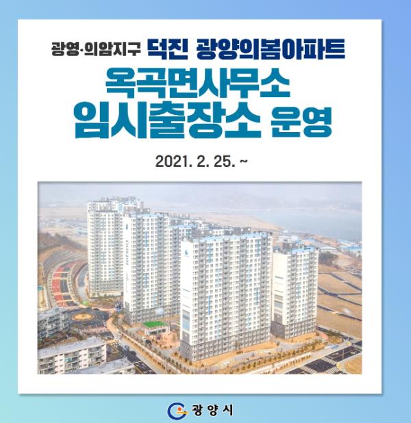 [한국연예축제일보, 유혜경기자] 광양시가 광영·의암지구 덕진봄아파트 입주민의 행정편의를 위해 입주예정일인 2월 25일부터 아파트 내 경로당에 임시출장소를 개소한다.