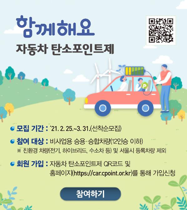 자동차 탄소포인트제는 가정에서 에너지 사용량을 줄일 경우 지급하는 탄소포인트제를 자동차 분야까지 확대한 온실가스 감축프로그램으로 참여기간동안 주행거리 감축실적에 따라 2∼10만원의 인센티브가 12월에 지급된다.