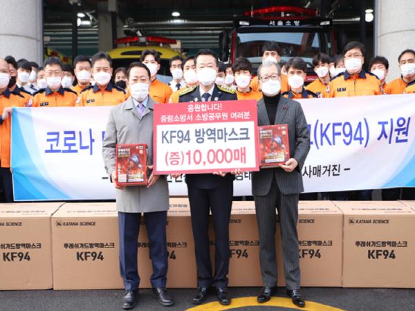 [한국연예축제일보, 허난세기자] 서울특별시의회 김태수 의원은 22일 시사매거진 김길수 발행인과 함께 재난관리에 만전을 기하고 있는 중랑구 신내동 중랑소방서를 찾아 ‘KF94 방역 마스크’ 1만장을 전달했다.