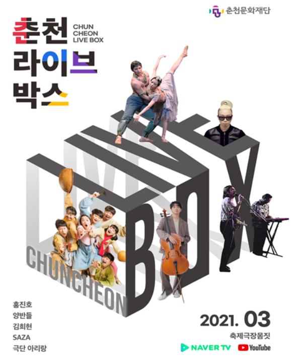 [한국연예축제일보, 이순례기자] 춘천문화재단은 2021년 3월 3일부터 17일까지 매주 수요일, 토요일 저녁 8시 축제극장 몸짓 기획공연 ‘춘천 라이브박스’로 고품질 온라인 라이브 스트리밍 공연을 준비한다. 춘천문화재단 유튜브와 네이버TV에서 실시간으로 관람할 수 있다.