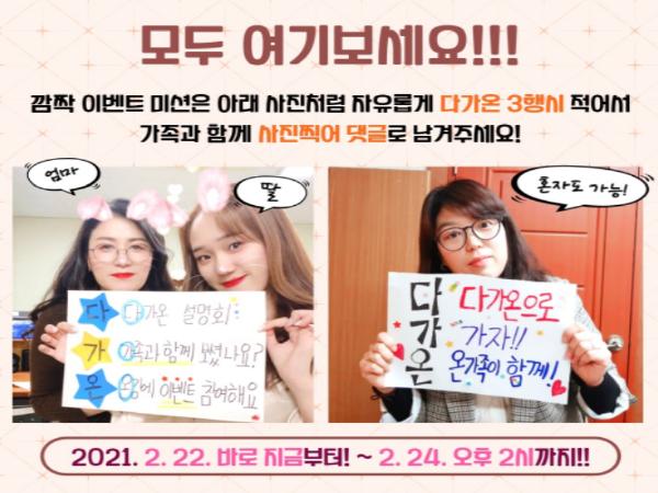 다가온 사업은 다문화가족과 지역 주민이 서로 소통하고 문화를 상호교류하는 사업으로, 코로나19로 인해 침체되어 있는 다가온 자조모임 외 세계문화 페스티벌 등 다양한 사업의 활성화를 유도하기 위해 사업설명회와 함께 삼행시 댓글 이벤트를 추진한다.