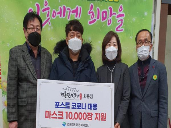 [한국연예축제일보, 유혜경기자] 의정부시 호원2동 행정복지센터는 명륜진사갈비 회룡점가 2월 22일 코로나19로 어려움을 겪고 있는 취약계층에 전달해 달라며 마스크 1만 3천 매를 기탁했다고 밝혔다.