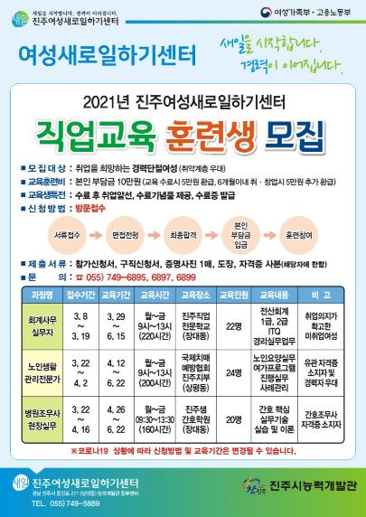 [한국연예축제일보, 유혜경기자] 진주시 능력개발관 부설 진주여성새로일하기센터에서는 3월 8일부터 회계사무실무자 과정을 시작으로 2021년 직업교육훈련 교육생을 모집한다고 23일 밝혔다.