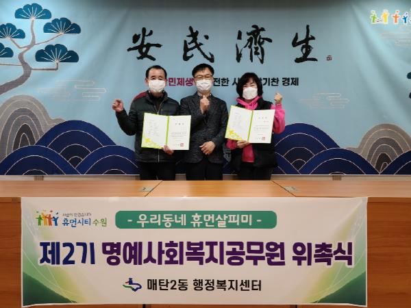 [한국연예축제일보, 유혜경기자] 지난 22일 수원시 영통구 매탄2동 행정복지센터(동장 김철수)에서는 제2기 명예사회복지공무원 위촉식을 개최했다.