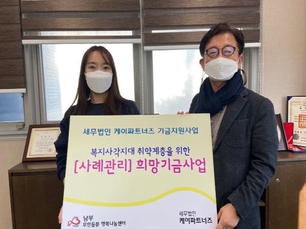 [한국연예축제일보, 유혜경기자] 세무법인 케이파트너즈(대원세무회계)는 23일 복지사각지대 및 취약계층 지원을 위해 광주시 남부 무한돌봄행복나눔센터에 성금 1천100만원을 기탁했다.