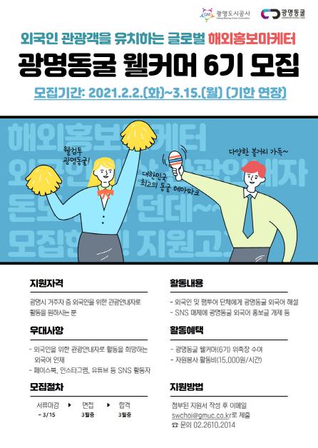 [한국연예축제일보, 유혜경기자] 광명도시공사는 광명동굴의 다국적 홍보단(자원봉사자)인 ‘광명동굴 웰커머 6기’모집을 오는 3월 15일까지 연장한다고 밝혔다. 이번 연장은 더 많은 외국어 능통자에게 직업체험 혜택을 제공하기 위해 결정됐다.