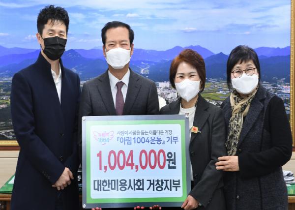 [한국연예축제일보, 유혜경기자] 거창군은 지난 22일 (사)대한미용사회 거창지부(지부장 구희자), 남상면 자율방범대(대장 백현호), 주상면 원남산마을(이장 이성호), 가조면 에버그린 전원마을(회장 이익배)에서 아림1004 후원금으로 각각 1,004천 원을 기탁했다고 밝혔다.