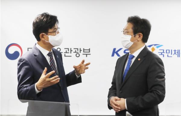 박 구청장은 2월 23일 오후 1시 30분, 스포츠산업종합지원센터(송파구 올림픽로424) 개관식에 앞서 황 희 문화체육관광부 장관과 환담 시간을 가졌다.