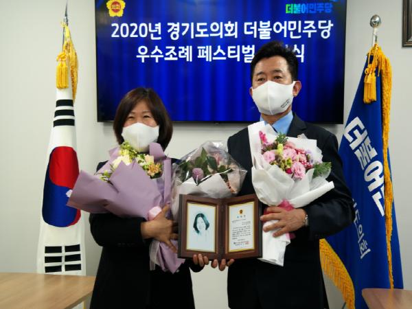 [한국연예축제일보, 허난세기자] 경기도의회 경제노동위원회 남운선 의원(더민주, 고양1)은 2월 23일(화) 경기도의회 교섭단체 대표의원실에서 진행된 ?년 경기도의회 더불어민주당 우수조례 페스티벌’에서 우수상을 수상했다.