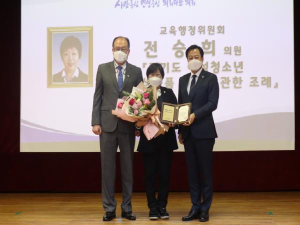 이날 우수조례에 선정된 「경기도 여성청소년 보건위생용품 지원에 관한 조례」는 전승희 의원이 2019년 12월 발의하여 2020년 1월 공포된 조례로, 도내 모든 여성청소년들이 생리용품 구매에 어려움을 겪지 않도록 지원하여 성장기 여성 아이들의 위생안전과 건강이 위협받지 않도록 하고, 궁극적으로는 보편적 복지로써 여성의 ‘월경권’이 당당하게 보장받는 사회분위기 조성에 나서고자 제정되었다.