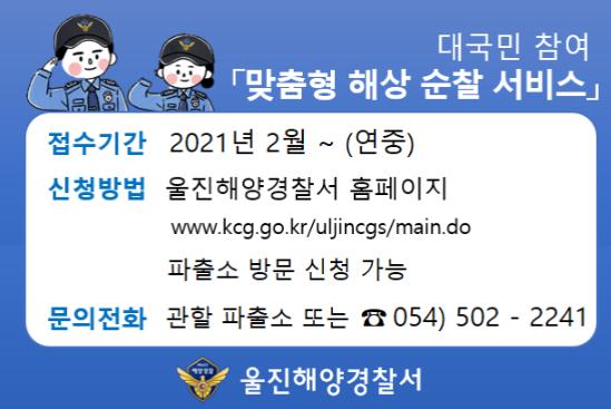 「대국민 맞춤형 해상순찰」은 울진해경 정부혁신 실행계획 중 하나인 “대국민 참여 맞춤형 해상순찰 서비스 시행”의 일환으로, 국민이 원하는 순찰 장소·시간을 신청 받아 관내 치안 여건, 현황 등을 고려하여 순찰 대상에 포함하는 국민 참여형 순찰 방식이다.