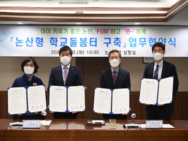 시는 23일 논산계룡교육지원청-논산동성초등학교-논산중앙초등학교와 ‘논산형 학교돌봄터’운영을 위한 업무협약을 체결했다.