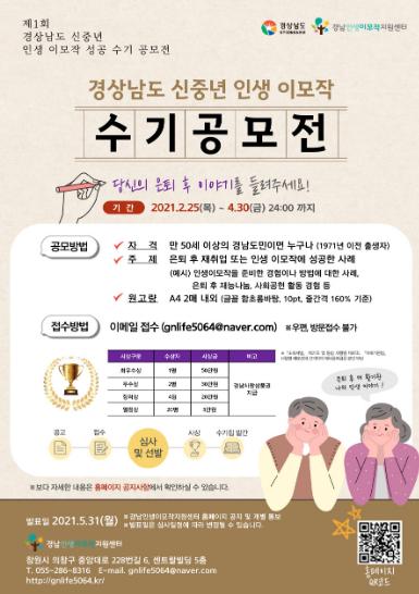 [한국연예축제일보, 안성경기자] 경상남도는 지역의 신중년 세대를 대상으로 인생이모작 성공 수기 공모전을 개최한다. 이번 공모전은 신중년 세대의 인생 2막에 대한 사회적 관심을 도모하고 은퇴 후 삶의 중요성을 알리기 위해 기획되었다.